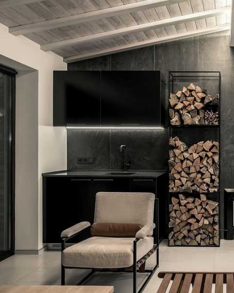 Особенно если у вас не просто дачный домик-избушка, а полноценный загородный дом с соответствующим дизайном. Комната отдыха в такой бане внутри будет выглядеть почти так же, как обычная кухня-гостиная. Даже функционально обычно пространство распределяют так же: зона готовки, зона отдыха.