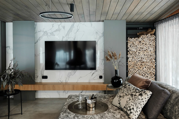 Дизайн комнаты отдыха бани в стиле минимализм будет мало похож на типичный дачный интерьер. В оформлении используют много камня, в основном мрамор, оникс, травертин, гранит — или их имитации. Дерево применяется как в мебели, так и в отделке, но в более «аккуратном» виде, без грубых неотесанных досок и заметных несовершенств. Все функциональные зоны в комнате технически оснащены. Декора — минимум, в основном это несколько знаковых предметов.