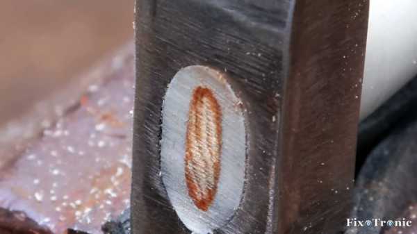 Вновь нагреваем сплющенный конец заготовки рукояти и металл вокруг отверстия строительным феном, и вставляем его в отверстие головки молотка. При необходимости подбиваем ручку сверху для того, чтобы сплющенный конец вышел с противоположной стороны всада на некоторую величину.