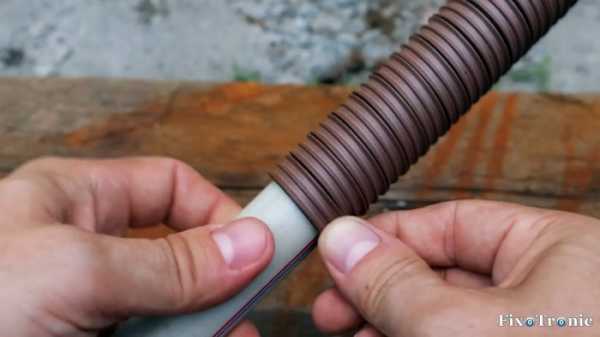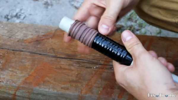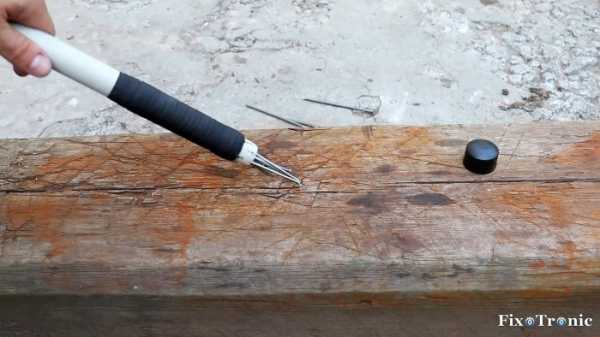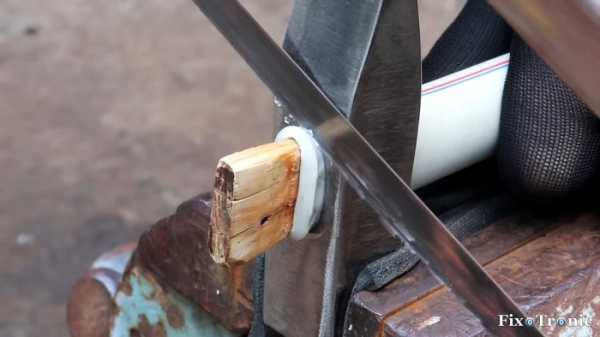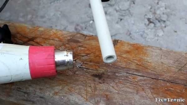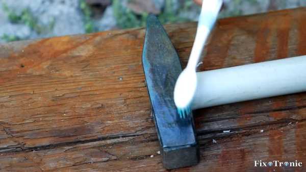 Снова прогреваем выступающий из головки молотка пластик строительным феном и вбиваем в продолговатое отверстие трубной заготовки заранее подготовленный по размеру и форме деревянный клин до упора.