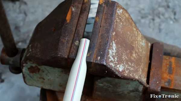 Отрезаем ножовкой по металлу необходимый по длине кусок толстостенной пластиковой трубы, нагреваем один его конец строительным феном и сплющиваем между губками тисков до необходимого размера.