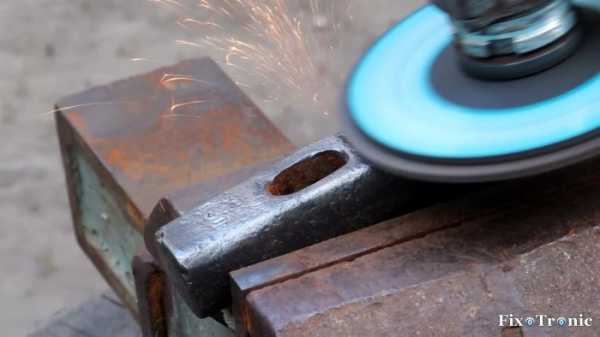 Головку молотка очищаем от многолетней ржавчины и других отложений последовательно жесткой металлической щеткой, а затем – болгаркой, зажав головку в тиски. Той же болгаркой снимаем небольшой слой металла со всех поверхностей головки молотка, чтобы удалить наклеп, каверны, глубокие царапины и другие повреждения.