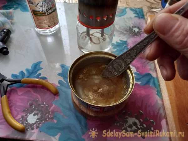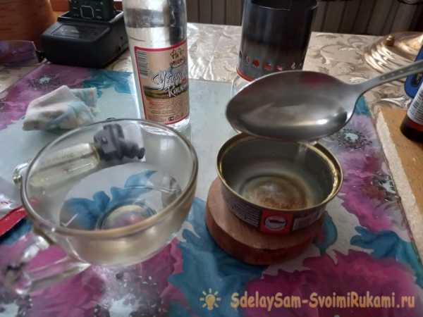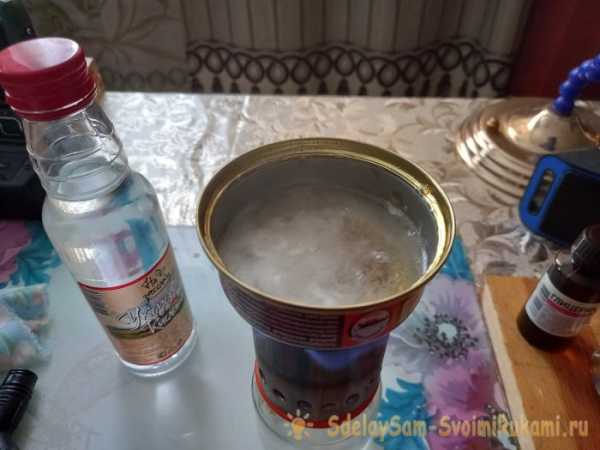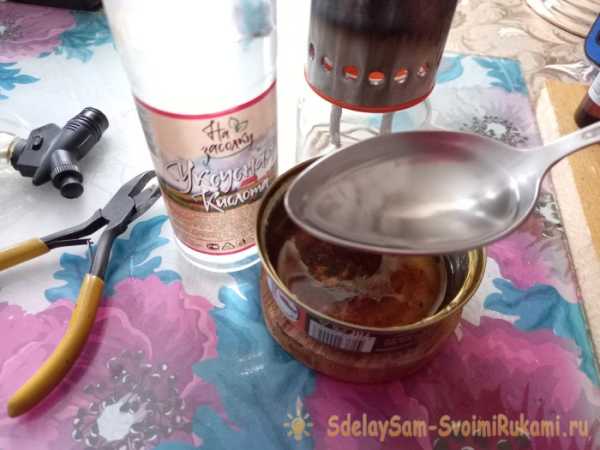 В подготовленную металлическую емкость (я взял вымытую консервную банку) вливаем три столовые ложки обычной воды.