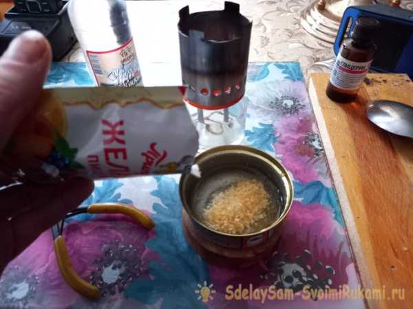 При помощи плоскогубцев или салфетки, снимаем горячую емкость с кипящей водой, и сразу высыпаем туда 10 гр. желатина.