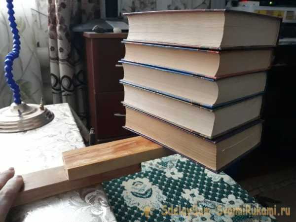 Лучше, конечно, использовать специальные струбцины, но за их неимением сойдет и что-нибудь тяжелое, типа стопки толстых книг. Оставляем склеиваемые дощечки под прессом часов на 15-18. А лучше на сутки. По прошествии указанного времени, достаем из-под пресса склеенные деревяшки, и испытываем на разрыв. Та нелегкая стопка книг, которыми я придавил вчера дощечки, с легкостью была удержана склеенной частью!