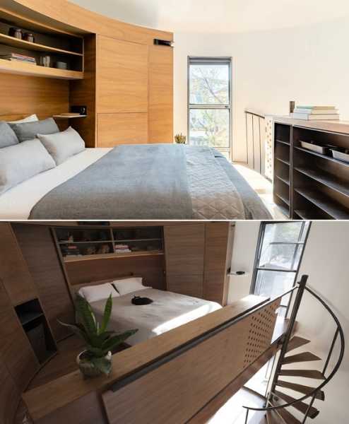 У спальню на мезоніні можна потрапити ефектними гвинтовими сходами, які стали головною родзинкою житлового простору і доповненням до сталевих елементів дизайну. Спальня може похвалитися великим об’ємом, чудовим освітленням за рахунок світлового люка, вікна та частини відкритого простору, а також місткими вбудованими шафами, що забезпечують достатню кількість місць для зберігання. Стараннями розробника проекту вона є багатофункціональною зоною, оскільки легко перетворюється на повноцінний домашній кінотеатр завдяки великому екрану, що висувається, і схованому в шафі проектору.