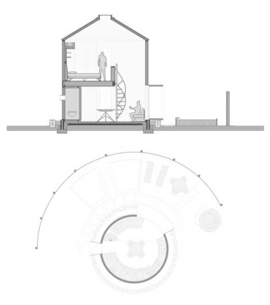 Двоповерхове планування Silo House і відкрите планування максимально задіяли вертикальну і горизонтальну площині, що дозволило зробити невеликий обсяг просторим житловим простором. Нижній рівень займає вітальня, їдальня, кухня та ванна кімната. Всі ці зони організовані по колу вздовж стіни, при цьому ванна захована за розсувними дверима (душова знаходиться в невеликій прибудові), ставши продовженням вбудованих шаф радіальної форми, розсувні двері та полиці яких зроблені на замовлення, як і всі меблі, встановлені впритул до закруглених стін.
