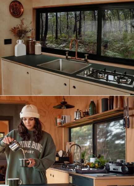 Кожна зона вийшла максимально функціональною з достатньою кількістю місця для пересування та зберігання. Переступивши поріг крихітного будинку, потрапляєш у чудово обладнану кухню, з бюджетним гарнітуром, виготовленим просто з меблевого щита (фанери з берези) без додаткових прикрас або дорогої фурнітури. Головне в цьому проекті – функціональність і зручність, розкіш вважається надмірністю, без якого більшість сучасників воліє відмовитися на користь стійкості та безпеки проживання.