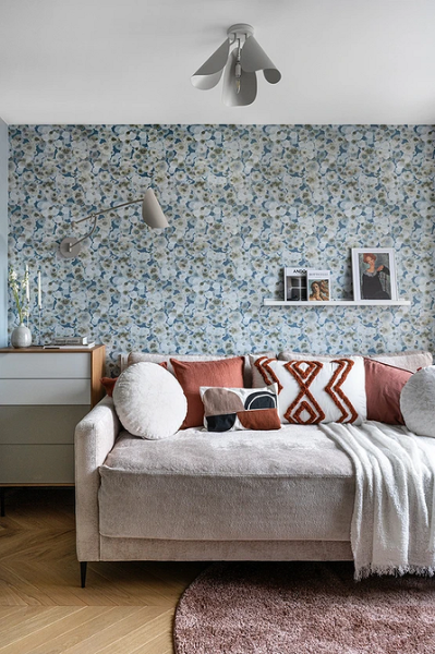 Важливо не перевантажити інтер'єр. Вибирайте орнамент у складній, але приглушеній палітрі: пісочній, димчасто-сірій, пастельній тощо. Шпалери з абстрактним малюнком роблять інтер'єр ефектним, не вимагаючи додаткового активного декору. Підходять і для традиційних, і сучасних напрямів.