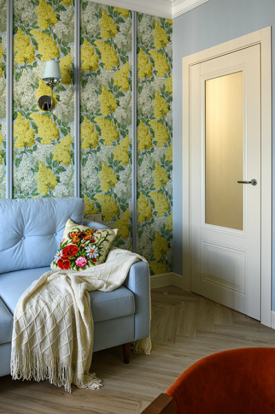 Яскраві шпалери застосовують як акценти на одній стіні або її ділянці, на стелі, дверях, меблях. Основне правило – замість чистих плоских кольорів вибирати складні тони: