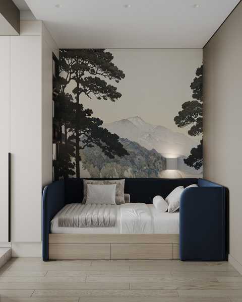 Щоб не перевантажувати інтер'єр, дизайнери використовують цей формат на одній стіні або навіть на її частині — у форматі панно. Малюнок вибирають у спокійних відтінках, на матовій поверхні. У такому вигляді масштабне зображення підходить і для маленької кімнати.