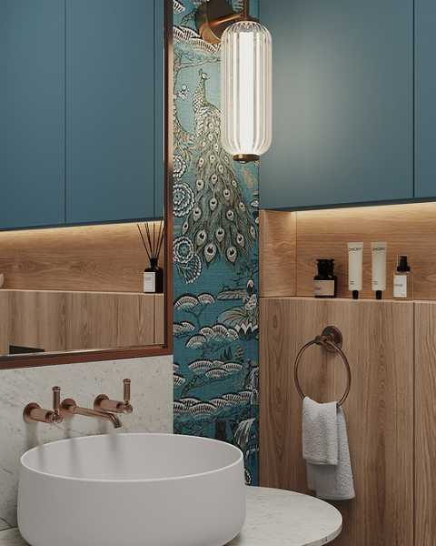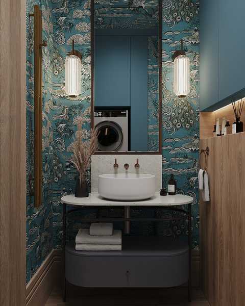 Покриття в синьо-сірій гамі краще поєднувати з теплими матеріалами: деревом, керамікою, ротангом, багатошаровим текстилем. Це пом'якшує палітру та компенсує холодність стін, робить обстановку більш затишною.