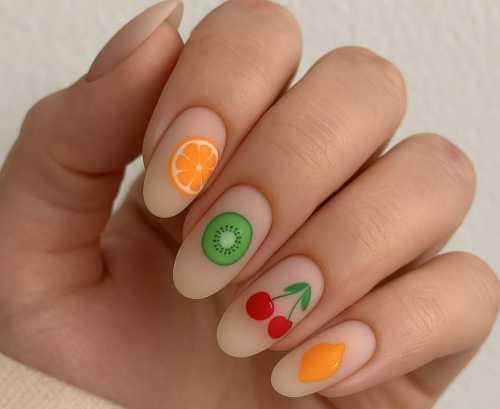 Що може бути більш «літнім», ніж маленькі вишеньки, часточки апельсина або ківі на нігтях? Фруктовий дизайн завжди виглядає свіжо, грайливо і буквально кричить: «Я на відпочинку!» Якщо ви не бажаєте, щоб вигляд був надто дитячим — поєднайте фруктовий малюнок із матовим покриттям або нюдовим фоном.