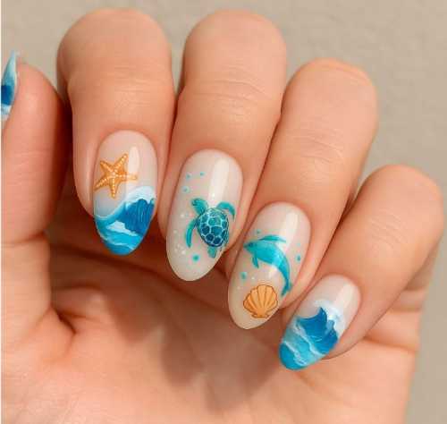 Один з найпопулярніших варіантів нейл-дизайну для відпустки — це морська тематика. Рекомендуємо не лінуватися і знайти майстра, який зможе створити не лише класичні хвилі, але й проявити максимальну креативність. Нейл-майстри радять спробувати не лише біло-блакитну палітру, а й зображення морських створінь і пляжні мотиви. Однак пам’ятайте, що надмірна кількість кольорів на нігтях може виглядати занадто «вагомо».